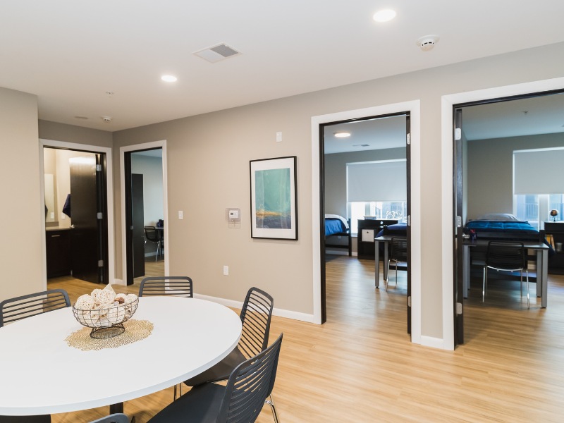 - Left to right bottom: student bedroom, student suites with 3 bedrooms and 2 bathrooms, suite bathroom
